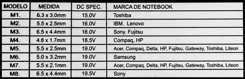 - Voltagens de saída: 15V /16V /18.5V /19V /19.5V /20V