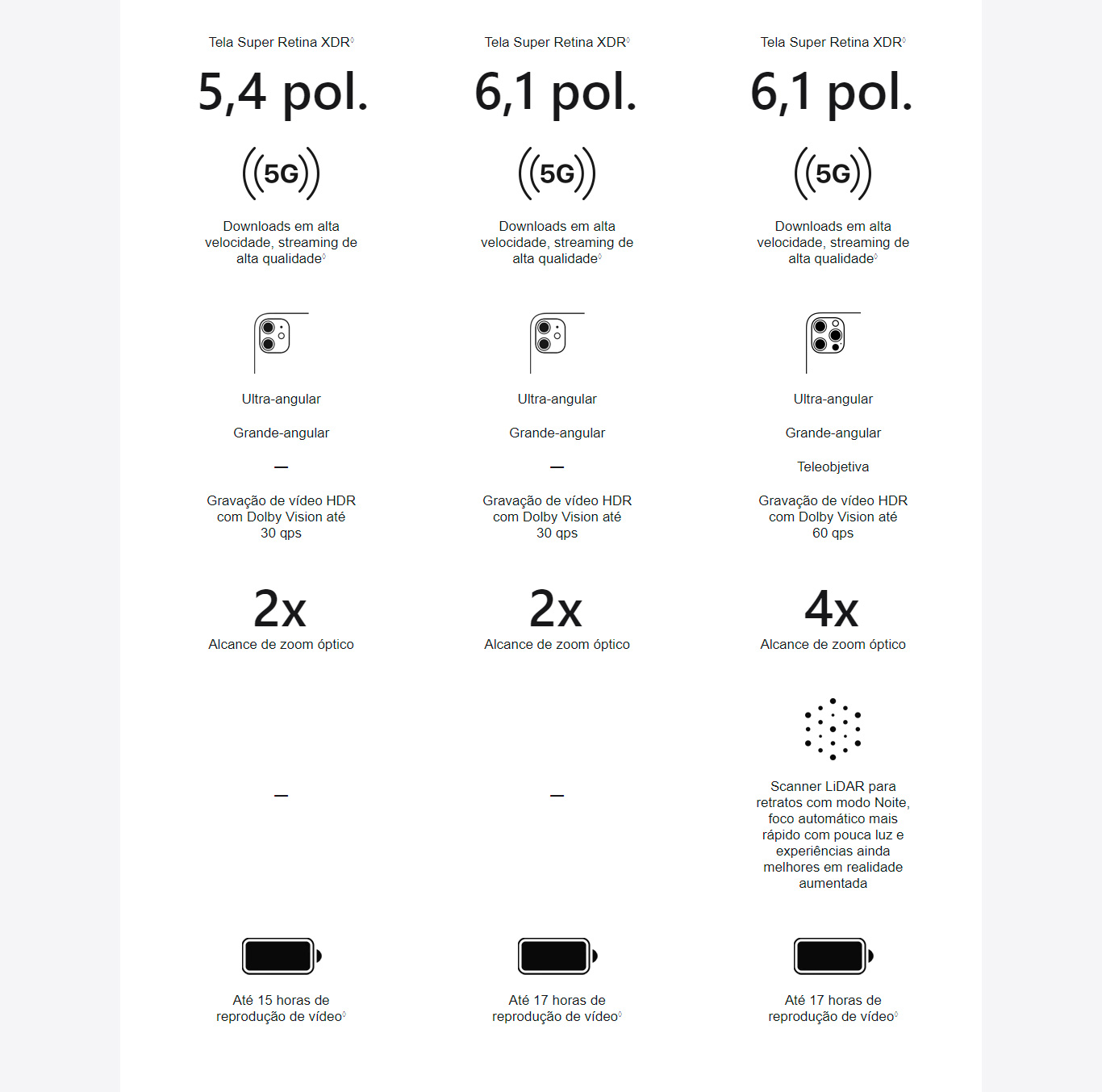 | Chamada de vídeo6: | FaceTime de vídeo via dados celulares ou Wi‑Fi FaceTime HD (1080p) de vídeo via 5G ou Wi‑Fi | |