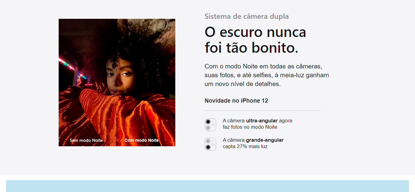| Câmera: | Sistema de câmera dupla (ultra-angular e grande-angular) de 12 MP Ultra-angular: abertura ƒ/2.4 e campo de visão de 120° Grande-angular: abertura ƒ/1.6 Zoom out óptico de 2x Zoom digital até 5x Modo Retrato com efeito bokeh avançado e Controle de Profundidade Iluminação de Retrato com seis efeitos (Luz Natural, Luz de Estúdio, Luz de Contorno, Luz de Palco, Luz de Palco Mono, Luz Brilhante Mono) Estabilização óptica de imagem (grande-angular) Lente de cinco elementos (ultra-angular); lente de sete elementos (grande-angular) Flash True Tone com mais brilho e sincronização lenta Panorama (até 63 MP) Lente coberta com cristal de safira Focus Pixels a 100% (grande-angular) Modo Noite (ultra-angular e grande-angular) Deep Fusion (ultra-angular e grande-angular) HDR Inteligente 3 com Detecção de Cena Captura de ampla tonalidade de cores para fotos e Live Photos Correção de lente (ultra-angular) Correção avançada de olhos vermelhos Estabilização automática de imagem Modo contínuo Fotos com localização geográfica Formatos de imagem capturados: HEIF e JPEG | |