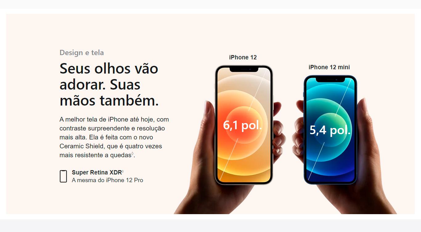 Informação baseada na comparação entre a parte da frente do iPhone 12 e iPhone 12 Pro (em Ceramic Shield) e a do iPhone da geração anterior.