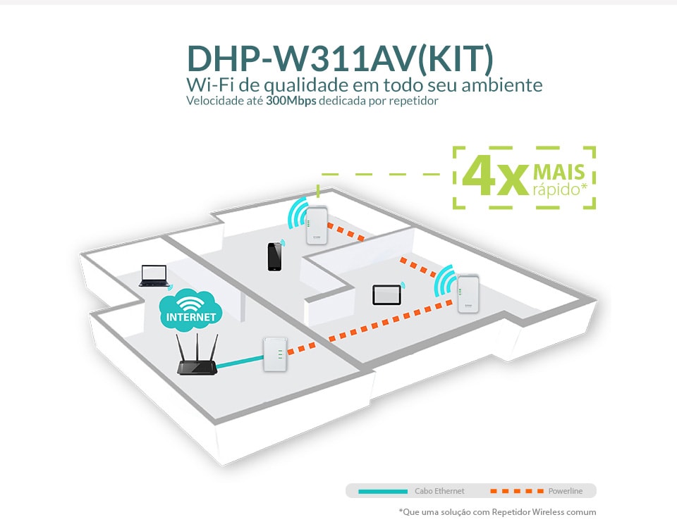 Com o Kit Repetidor D-Link DHP W311AV AV500 você configura e começa a desfrutar da conveniência e confiabilidade de uma rede wireless ou Powerline de alta velocidade. Assim, é possível transmitir filmes, baixar arquivos grandes e desfrutar de uma conexão de Internet rápida para navegar na WEB.