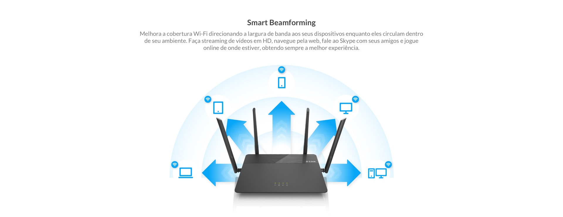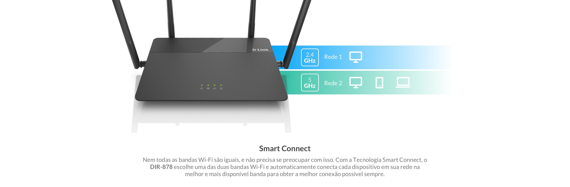 Nem todas as bandas Wi-Fi são iguais, e não precisa se preocupar com isso. Com a Tecnologia Smart Connect, o DIR-878 escolhe uma das duas bandas Wi-Fi e automaticamente conecta cada dispositivo em sua rede na melhor e mais disponível banda para obter a melhor conexão possível sempre.