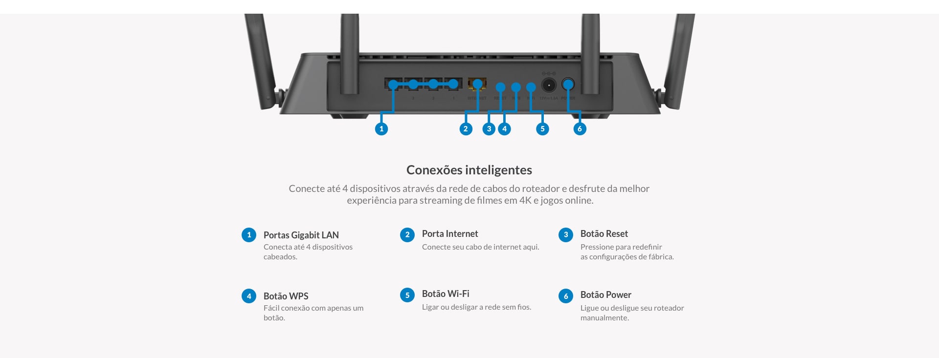| Interfaces do Dispositivo | 1 x WAN 10/100/1000Mbps 4 x LAN 10/100/1000Mbps Wireless AC | |