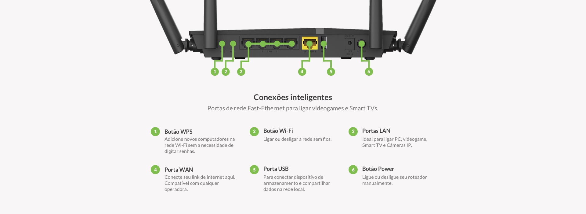 | Interfaces do Dispositivo | 1 x Porta USB 2.0 1 x WAN 10/100Mbps 4 x LAN 10/100Mbps Wireless AC | |