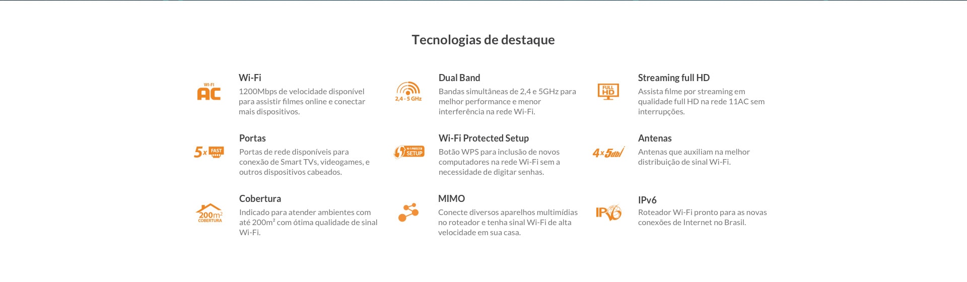- Wi-Fi: 1200Mbps de velocidade disponível para assistir filmes online e conectar mais dispositivos.